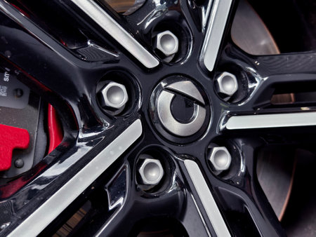 Omoda car name on the alloy wheel of a Chinese car close-up. Almaty, Kazakhstan - September 18, 2023