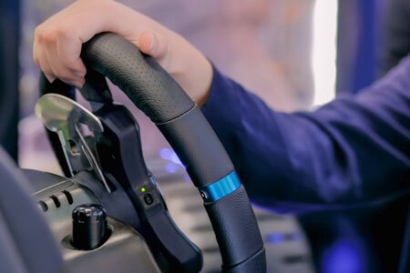 Entertainment, hobby, technology and leisure time concept - closeup view: man gamer hand using black gaming steering wheel joystick and playing in car drive simulator at modern technology exhibition