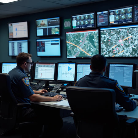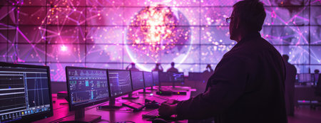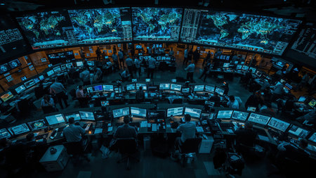 Advanced command center featuring numerous screens showing global maps, data, and analytics. Professionals work at computer stations in a dimly lit, high-tech setting.