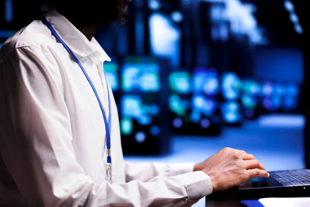 Data center computer scientist working on databases supporting AI applications. IT worker in server room conducting experiments on artificial intelligence algorithms improvements