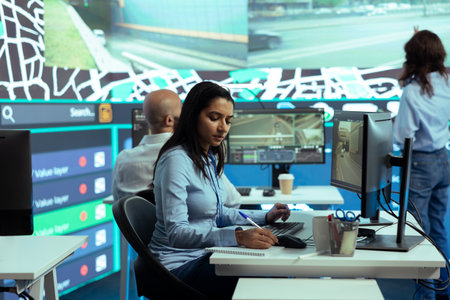 Indian woman employee locating delivery truck drivers via satellite map, sending gps coordinates for their destination to avoid traffic and ship orders faster. Operator studies CCTV footage.