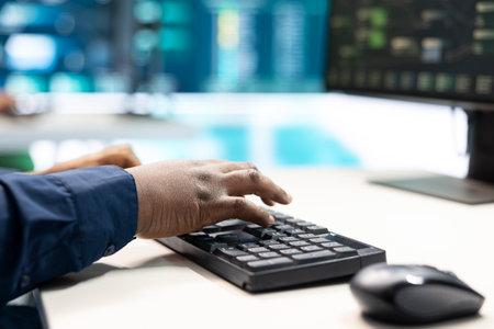 Close Up of a Professional Office Specialist Working on Desktop Computer in Modern Technological Monitoring Control Room with Digital Screens. Manager Typing on keyboard and Using Mouse.