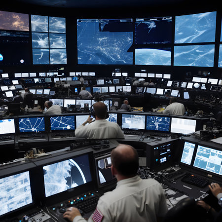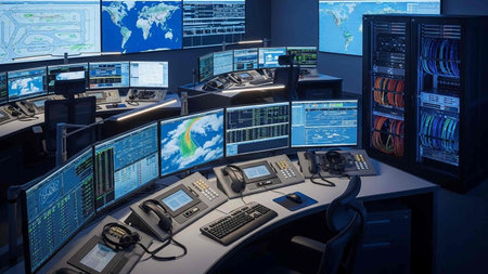Advanced control room with numerous monitors and large screens showing global maps and data. Professionals working on computers in a high-tech environment.