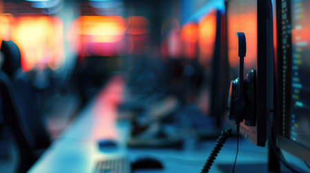 A dimly lit control room filled with flickering screens and a modern console. The ambient light creates an atmosphere of concentration and highlights the importance of the tasks at hand.