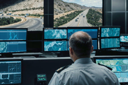 Transportation Specialist Monitoring City Traffic Data And GPS Navigation On Control Room Monitors