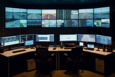 surveillance room filled with screens displaying security feeds from different locations, created with generative ai