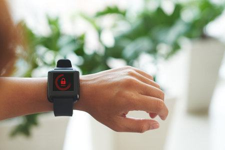 A woman programmer is browsing the Internet in smart phone to protect a cyber security from hacker attacks and save clients confidential data. Padlock Hologram icons over the typing hands. Formal wear