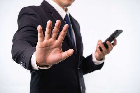 Business man wearing suit and holding mobile phone isolated on white background doing stop signal with palm of the hand. Warning expression with negative and serious gesture on the face. Stop the war signal concept.