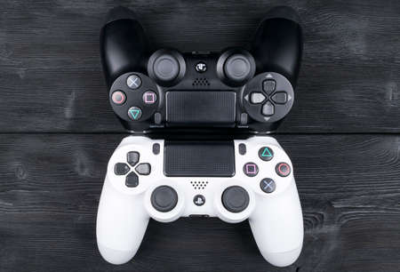 Sankt-Petersburg, Russia, September 24, 2017: Sony PlayStation 4 Slim 1Tb revision and 2 dualshock game controller on the wooden table background. Home video game console