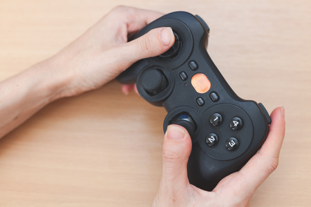 Entertainment, home electronics, gaming concept: a teenager hands holding wireless controller gamepad playing console video game