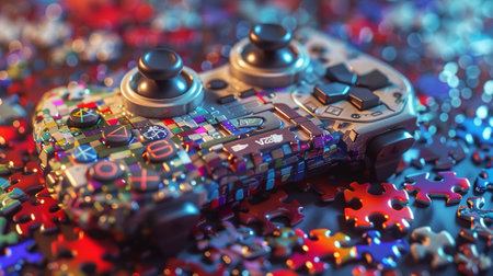 Gamepad hologram over working cpu in background. Futuristic circuit board 3d illustration. Concept of create and coding game, video gaming and online play.