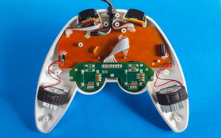 Photo of classic disassembled wired modern silver colored game pad controller laying on blue background.