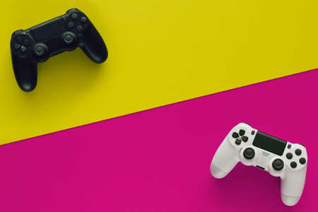 Stock photo of two gamepads on two colored backgrounds and copy space in the middle