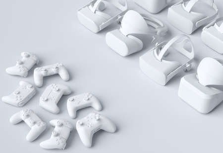 Top view virtual reality glasses and controllers for online gaming on white