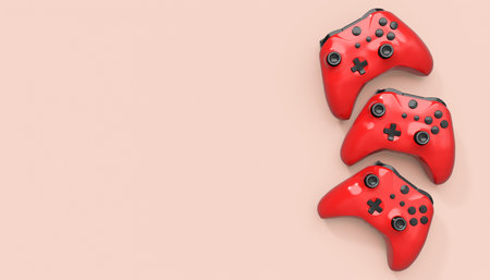 Realistic red azure video game joysticks or gamepads on pink background. 3D rendering of streaming gear for cloud gaming and gamer workspace concept