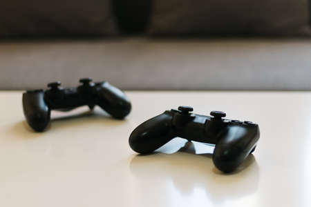 Photo of two gamepads with selective focus, on white table with gray sofa in the background, home interior. with copy space.