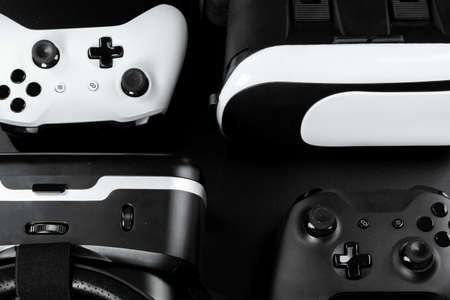 Virtual reality headset and retro joysticks on black background. Entertainment, video game. top view
