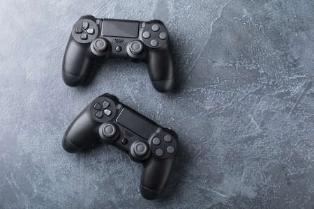 Modern game pads on gray background