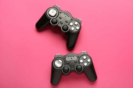 Modern game pads on color background