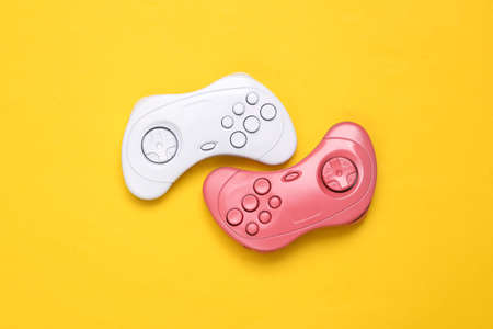 Video game Gamepads. Gaming concept. Top view two retro joysticks on yellow background.