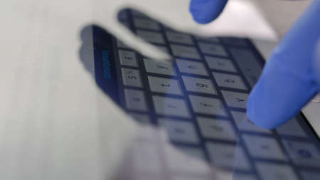 Hands in Blue Surgical Gloves Typing on Tablet Touchscreen Keyboard