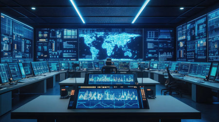 Advanced command center featuring numerous screens showing global maps, data, and analytics. Professionals work at computer stations in a dimly lit, high-tech setting.