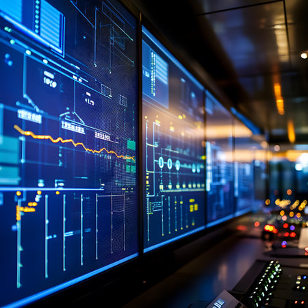 A modern control room featuring multiple high-tech screens displaying data and analytics. The sleek design emphasizes functionality and advanced technology, perfect for operations and monitoring tasks.