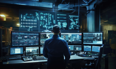 A focused control room operator observes multiple screens displaying critical data and surveillance footage in an industrial setting, ensuring safety and efficiency.