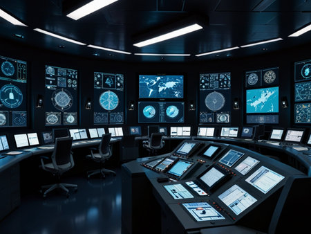 Futuristic control room with digital screens displaying complex data and analytics for advanced monitoring and management.