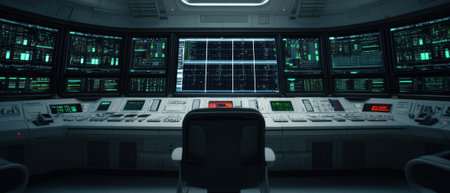 Quiet and high-tech control room with empty monitors and advanced equipment