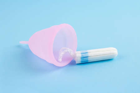 Different types of feminine hygiene products - pink menstrual cup and tampon on blue background with copy space. Women health and hygiene concept, alternative hygiene products, selective focus