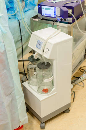 suction unit tube and storage tank for mucus of patient and oxygen flow regulator with tube scale for help breathing patients on wall in room at hospital