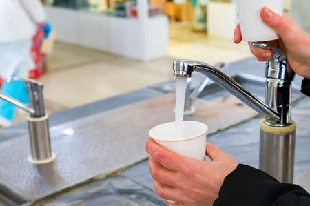 White plastic cup with cold sparkling mineral water against a stone countertop.