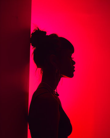 Double exposure portrait. Sensitive woman. Tenderness fragility. Red neon color light defocused silhouette of pensive female face isolated on blue out of focus.