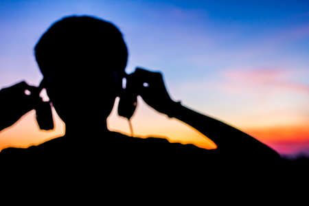 Silhouette of a professional landscape travel photographer holding a camera on a mountain. Silhouettes of many professional photographers posture in the evening