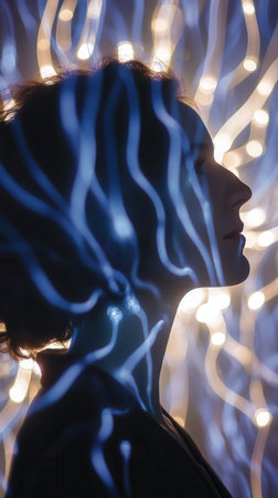 Silhouette of a woman's profile with blue light waves projected on her face. Ethereal and futuristic mood, symbolizing technology and consciousness. For projects on AI or innovation.