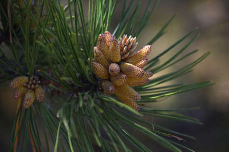 Pine flower. Blooming pine branches. Blurred background. Fresh morning. Green pine cone.