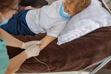 Nurse putting a drip on the arm of her patient in mask during pandemic of Covid 19