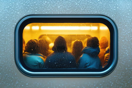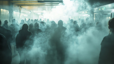 Misty subway station filled with silhouetted commuters during rush hour in the evening