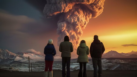 Volcanic eruption with massive ash cloud and flowing lava down the mountain