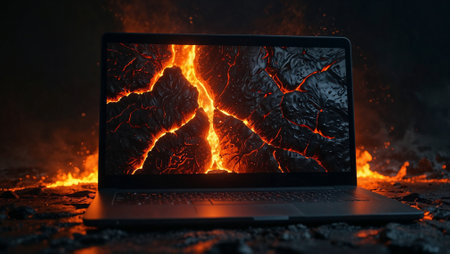 Fantasy background of a hot lava coming from cracked laptop screen. Synergy of nature and technology. Eco friendly industry concept. Copy space.