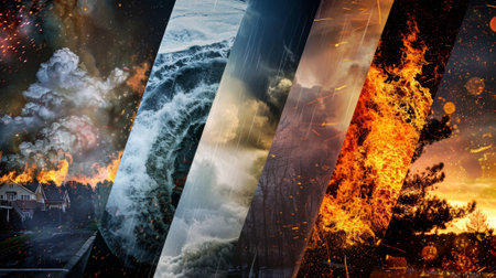 A collage of extreme weather events including hurricanes floods and wildfires conveying the intensity and frequency of natural disasters linked to climate change.