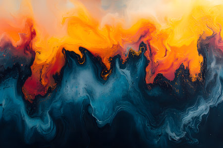 A dramatic abstract painting features swirling waves of vibrant orange contrasting with deep blue tones, creating a dynamic and captivating visual. the fluid motion and rich colors evoke a sense of energy and movement, ideal for modern decor. Generative AI
