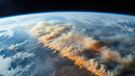 Planet Earth covered in wildfires with smoke plumes rising into space, representing environmental destruction