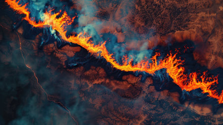 Aerial view capturing the fiery texture of molten lava flowing through landscapes