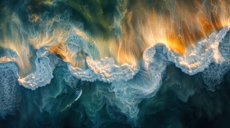 Abstract aerial view of ocean waves with vibrant colors and patterns.