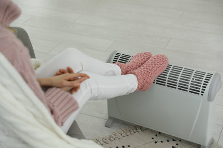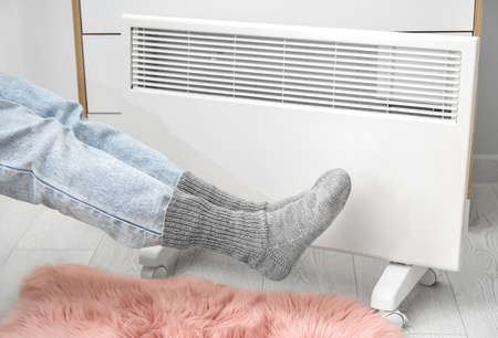 Woman warming feet on electric heater at home, closeup