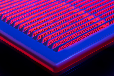 Abstract photo of a ventilation grille illuminated with red and blue light. Selective focus