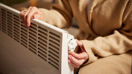 Woman adjusting power level on electric heater in warm home interior