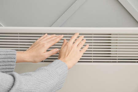 Woman warming hands at radiator. Concept of heating season